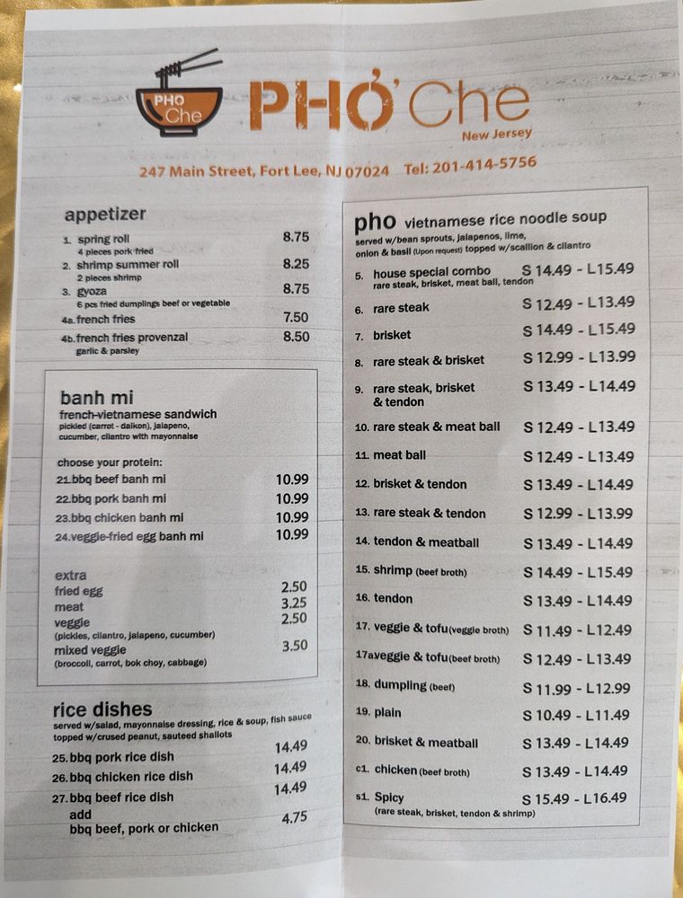 Pho Che, located in Fort Lee, NJ, offers a delightful selection of Vietnamese cuisine. The menu boasts flavorful options such as Banh Mi sandwiches with BBQ beef, pork, or chicken, as well as Pho bowls with various protein choices like rare steak, meatball, and tendon. One standout dish is the BBQ pork with rice, described as unexpectedly delicious by a satisfied customer. The cozy atmosphere and personable owners add to the overall dining experience, making it a hidden gem worth visiting. If you're in the mood for authentic French-Vietnamese food, make sure to try Pho Che for a satisfying and flavorful meal.
